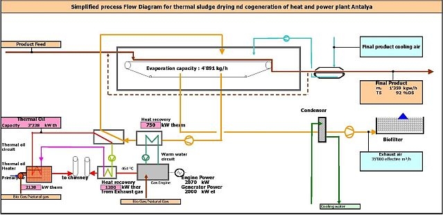 Antalya için gerçekleştirilen sistem, yeni geliştirilen ve patenti alınan düşük sıcaklıklı bir bantlı kurutucu olup, yaklaşık 2 MWeI net çıkış gücüne sahip olan bir gaz motorundan elde edilen atık ısı kullanılmak suretiyle saatte 5 ton su buharlaştırma kapasitesine sahiptir. Buna ilave olarak, tesis LNG-BİOGAZ ile destek yakma sistemine sahiptir.