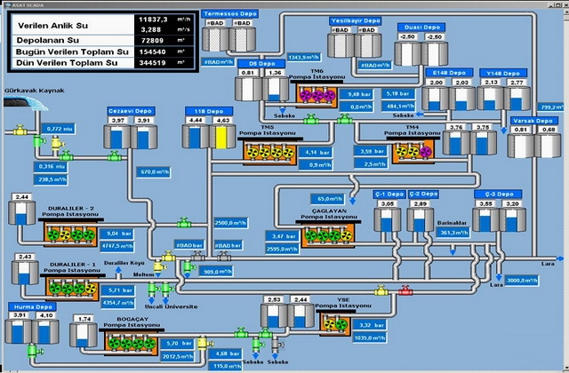 Mevcut SCADA sistemi sayesinde; depolardaki su seviyeleri, pompa istasyonlarında çalışan pompalar, pompa istasyonları ile ölçüm noktalarında basınç ve anlık debi değerleri, SCADA kontrolündeki vanaların durumları (açık, kapalı, pozisyon) ve şehre verilen anlık su, toplam su ile bir önceki gün verilen toplam su miktarları görülebilmektedir.