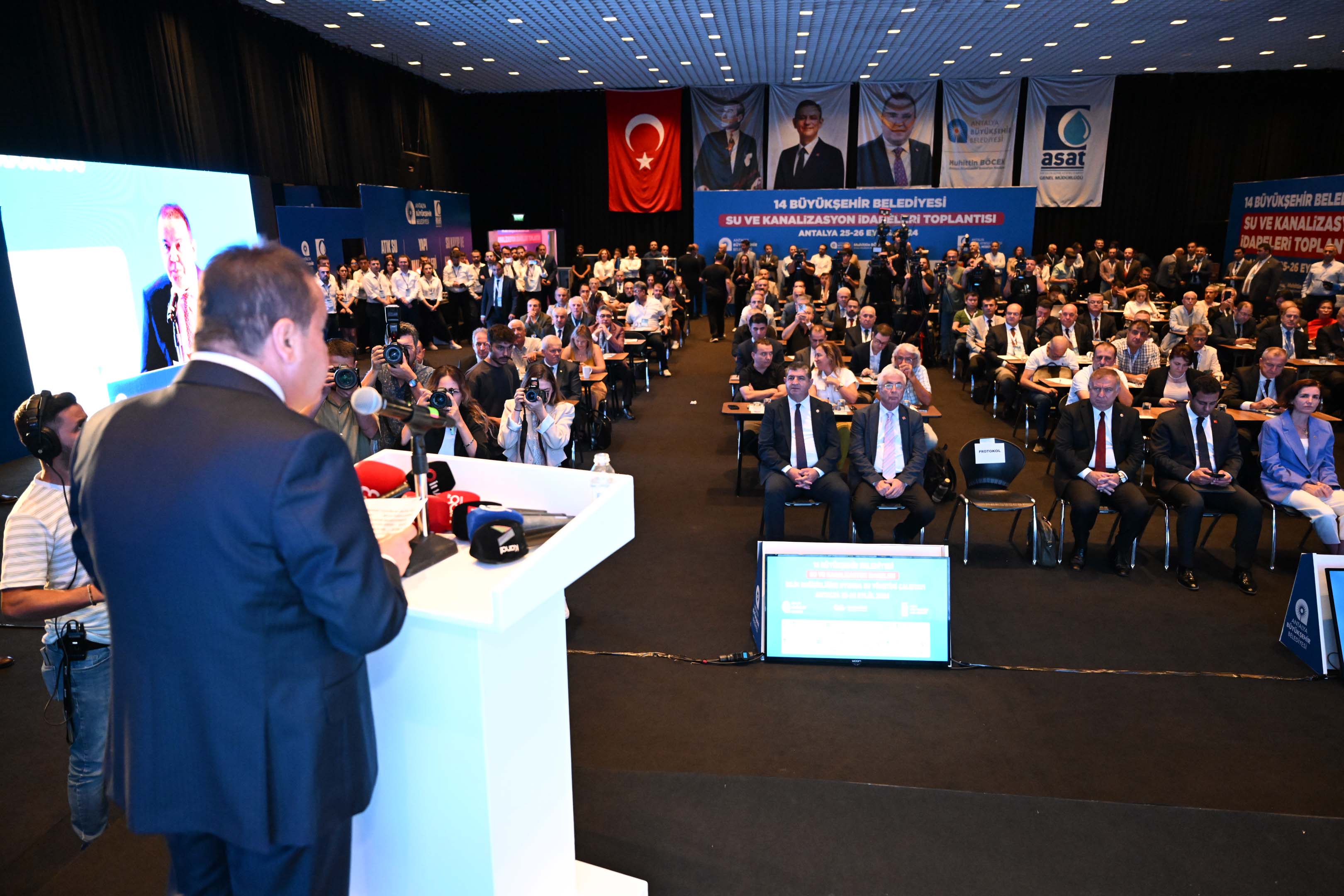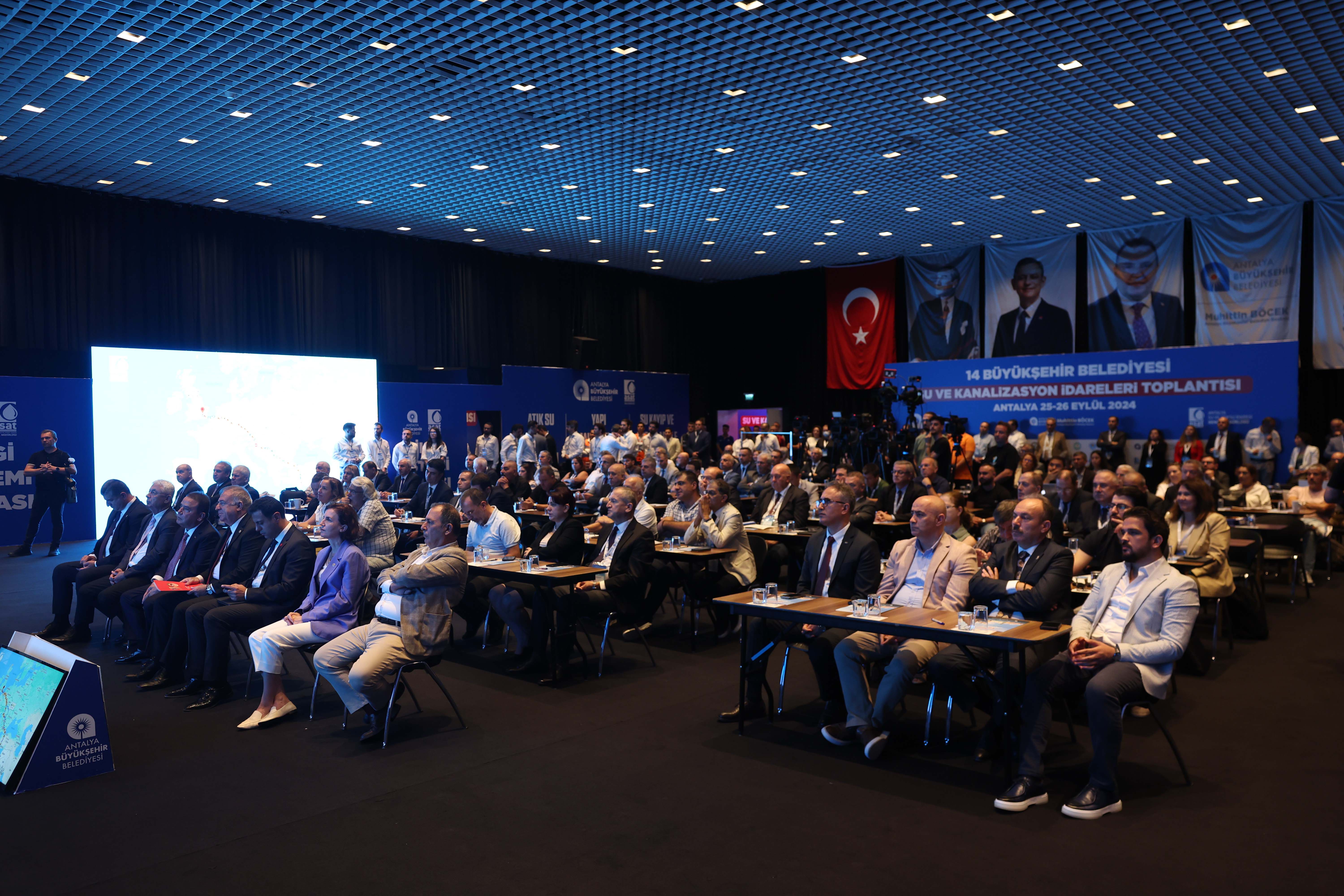 Türkiye nüfusunun yaklaşık yarısına hizmet veren 14 büyükşehir belediyesinin su ve atıksu idareleri, “İklim değişikliğine uyumda su yönetimi” konusunu görüşmek üzere Antalya Büyükşehir Belediye Başkanı Muhittin Böcek’in ev sahipliğinde Antalya’da toplandı. Gelecek nesilleri düşünerek entegre kentsel su yönetimi planını hazırladıklarını söyleyen Başkan Böcek, Antalya’ya güncel maliyetle 14 milyar 948 milyon TL alt yapı yatırımı yaptıklarını söyledi. CHP Yerel Yönetimler ve Dirençli Kentlerden Sorumlu Genel Başkan Yardımcısı Gökan Zeybek, önümüzdeki yıllar içerisinde su kıtlığının daha üst seviyeye çıktığı bir dönemle karşı karşıya kalınacağını belirterek, “CHP'li belediyeler olarak gereken önlemleri alıyoruz” dedi.
